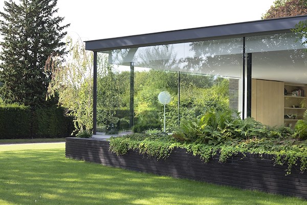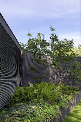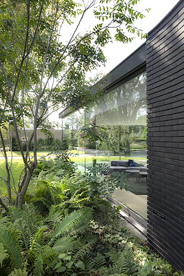 De gevel bestaat, naast de grote glazen puien, uit volledig zwart metselwerk. Hoewel de villa een grote mate van openheid in de gevels vertoont, voelt de woning volgens de architecten als een private en beschermde ruimte aan. Dit komt door de doordachte indeling en het weelderige groen, aan de voorzijde van het gebouw bijvoorbeeld dankzij in de gevel geïntegreerde plantenbakken.