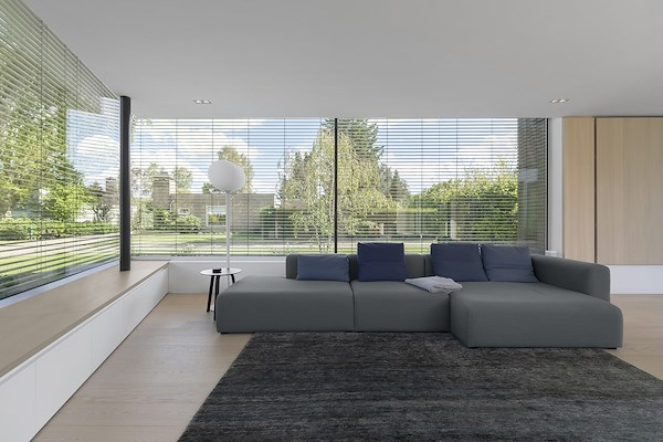 Het ontwerp van Bedaux de Brouwer Architecten en i29 zorgt tevens voor een sterke verbinding tussen binnen- en buitenruimte. In het midden van de woonkamer is een weelderig groene patio geplaatst. Grote glazen (schuif)puien geven vrij uitzicht op de omliggende tuin en het zwembad.