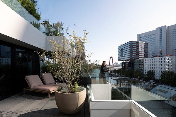 “Op de plek van The Muse stond een gebouw van de gemeente Rotterdam, dat vrijkwam omdat de daarin gehuisveste dienst naar het Timmerhuis werd verplaatst”, vertelt Caro van de Venne, die met Barcode Architects in de niet veel verderop gelegen Scheepmakershaven zetelt. “Mijn bureaupartner Dirk Peters en ik zagen er een prachtige locatie in voor een luxe woontoren, een typologie die in het centrum van Rotterdam nog bepaald niet goed was vertegenwoordigd.”