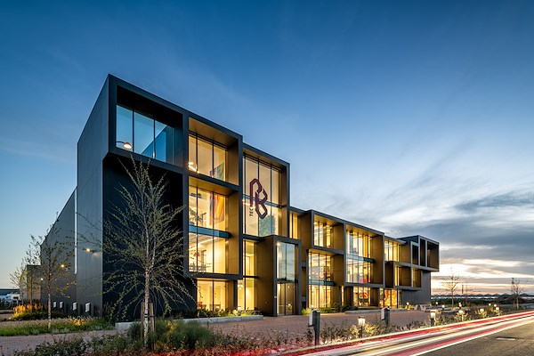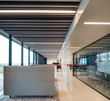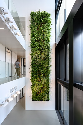 De kantoorvloeren zijn over drie lagen verdeeld tegen de gevel van de achtergelegen productiehal. Dankzij de verdiepinghoge glazen puien worden de medewerkers hier ruim voorzien van daglicht. Ook tussen de kantoren en de productieruimte is veel glas toegepast, om zo het contact tussen de verschillende afdelingen van het bedrijf te bevorderen.