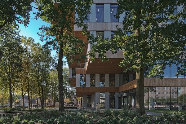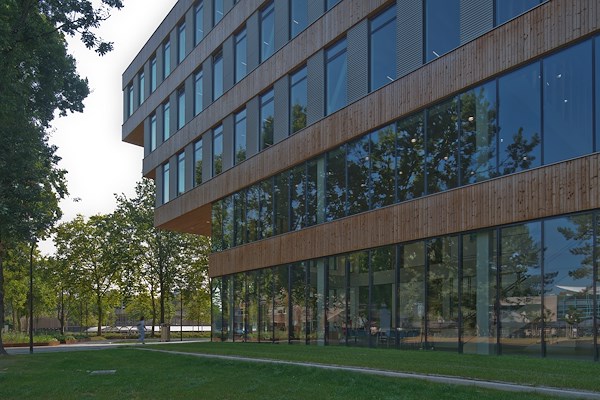 Zo bevindt de entree zich dankzij een ‘omarmende’ overstek in het hart van het gebouw. Direct daarachter begint een ‘diagonale boulevard’, die alle verdiepingen met elkaar verbindt en door een volledig transparante gevel bovendien zorgt voor een visuele verbinding met het groene hart van de campus.