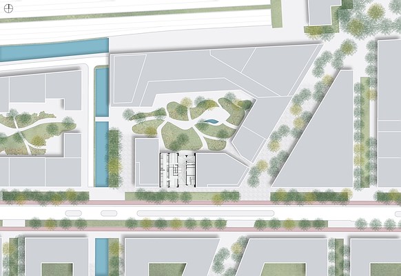 De toren maakt deel uit van een toekomstig bouwblok rond een gemeenschappelijke binnentuin en vormt samen met twee torens van het multifunctioneel complex