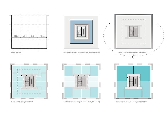 Tevens zijn alle woningen, ook de allerkleinste van 25 vierkante meter, voorzien van een balkon met uitzicht rondom. De sociale huurappartementen zijn bedoeld voor starters tot 28 jaar; zij mogen er maximaal vijf jaar wonen. De grootste appartementen zijn zestig m² groot, in de kroon bevinden zich maisonettes, zo laat LEVS architecten weten.