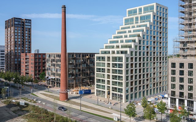 , bestaat uit 105 appartementen. Met zijn getrapte gevel reageert het gebouw op de beeldbepalende schoorsteen die ernaast staat.