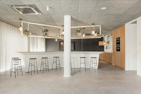 Het architectenbureau heeft de buitenruimte naar binnen getrokken door middel van een inpandig terras. Dit grenst aan de keuken, waar een speciaal ontworpen barmeubel werkt als blikvanger. Dit is ook de pek waar medewerkers en klanten geregeld in een ontspannen sfeer kunnen samenkomen voor bijvoorbeeld overleg, presentaties, pitches, recepties of informele ontmoetingen.