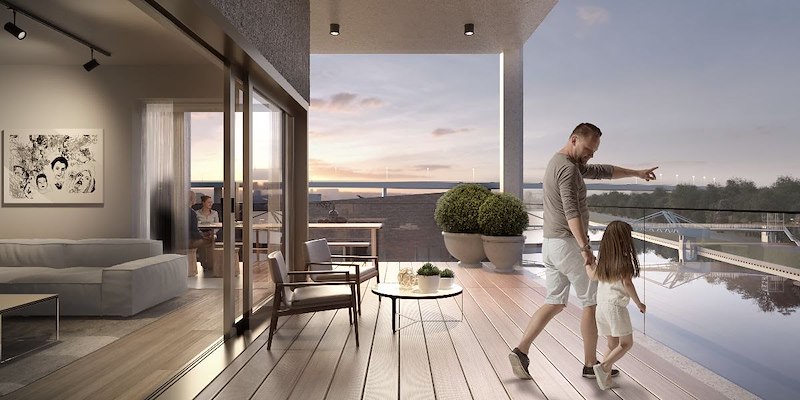 Bij het ontwerp heeft woongenot een belangrijke rol gespeeld. Atelier Kempe Thill ontwierp lichte en luchtige woningen met dubbele oriĆ«ntatie en een weids uitzicht. De woningen krijgen grote raampartijen; de royale balkons ā van 3 tot 3,5 m diep en over de gehele breedte van de appartementen ā vormen een vanzelfsprekend verlengstuk van het interieur.
