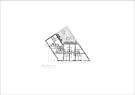 De plint, met een extra hoge verdiepingshoogte, volgt strak alle kavelgrenzen. De appartementen volgen de lijn van de Vijver- en de Bordeslaan, waardoor er in de luwte van het blok ruimte is ontstaan voor een gemeenschappelijke daktuin op de eerste verdieping, legt het architectenbureau uit.