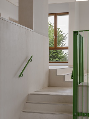 De gemetselde zuidgevel vormt met de hier gelegen centrale keuken het sociale hart van de school. Rond deze keuken, die direct aan de hoofdentree is gelegen, komen alle leeftijden onder een groot daklicht samen.