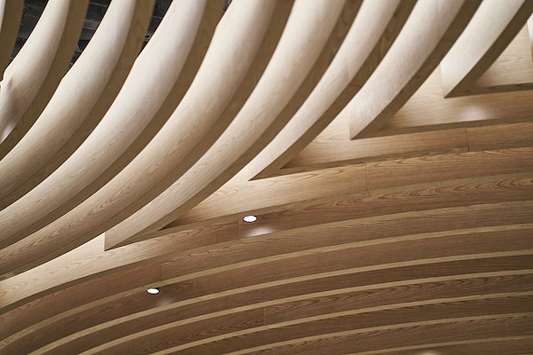 M+R heeft gekozen voor een warme en ingetogen kleurstelling en een ruim gebruik van hout. De receptie, bar en scheidingswanden zijn opgebouwd uit lagen multiplex. Ook de plafondringen bestaan uit hout; tussen de ringen is verlichting weggewerkt.