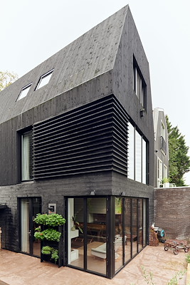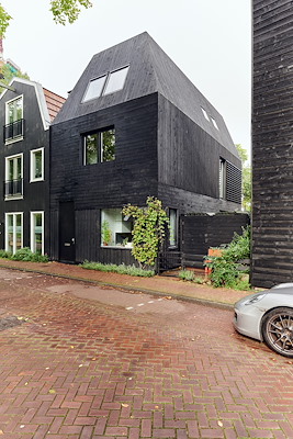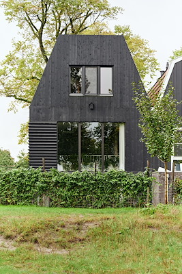 . De bekleding van de gevel in hout refereert aan de traditionele Waterlandstijl. In samenwerking met studio Rianknop is gekozen voor zwart gebrand hout om het grafische lijnenspel met de latten te benadrukken. Doorzetten van de zwart houten bekleding op het hellende dak heeft de abstractie van het volume versterkt.