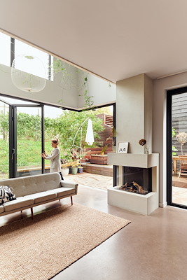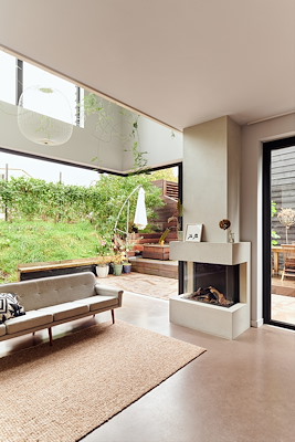Door middel van een harmonicapui met haakse hoek kan de gehele benedenverdieping worden geopend. De kleine tuin kan dan op mooie dagen fungeren als verlengstuk van de woonkamer. De gevlinderde betonvloer loopt door van binnen naar buiten, wat de twee zones sterk op elkaar betrekt.