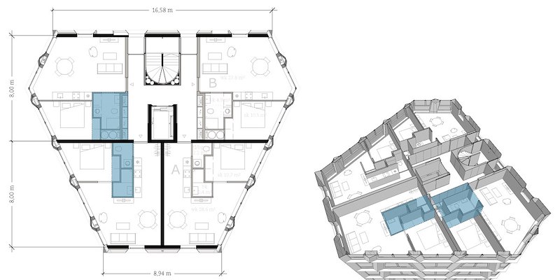 De draagconstructie is voorbereid om te kunnen worden doorgebroken, zodat op termijn appartementen kunnen worden samengevoegd. De torens zijn ontworpen zonder installaties in de dragende vloeren en wanden; daardoor kan na sloop van de gebouwen het beton schoon in de grondstoffencyclus worden teruggebracht als betonpuingranulaat, legt Arons en Gelauff uit.