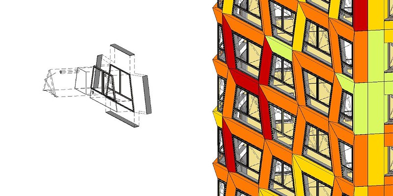 In de vormgeving gebruikt het bureau eenvoudige middelen, legt het uit. Door de torens onderling te draaien en van verschillende kleuren te voorzien ontstaat er een levendig beeld. De gevels sluiten aan bij het landschapsontwerp van TLU. “We kozen de gevelkleuren uit de bloeivormen van de boomsoorten die rondom de gebouwen worden geplant”, aldus Arons en Gelauff.