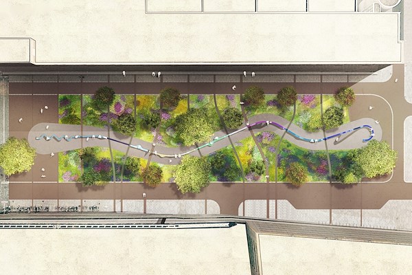 De gebouwen, bomen en beplanting rondom, en vooral de mensen die in het park lopen, elkaar ontmoeten of er neerstrijken, worden erin weerspiegeld alsof het een wateroppervlak is, aldus LOLA Landscape Architects. De opening van het nieuwe stadspark staat gepland voor juli.