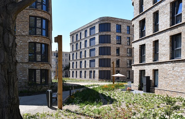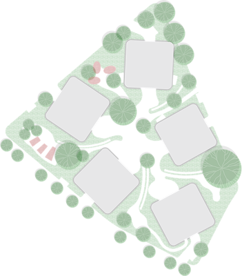 Drie gebouwen bieden plaats aan 119 levensloopbestendige sociale huurappartementen, terwijl de overige twee 64 zorgwoningen voor mensen met dementie bevatten. De panden zijn gegroepeerd rond een gemeenschappelijke groene buitenruimte waar bewoners hun zintuigen kunnen prikkelen en medebewoners, personeel en bezoekers ontmoeten.