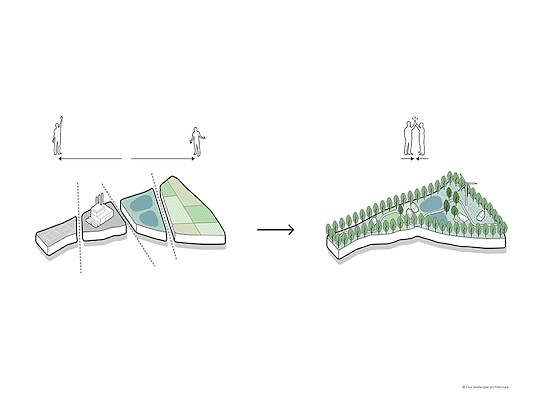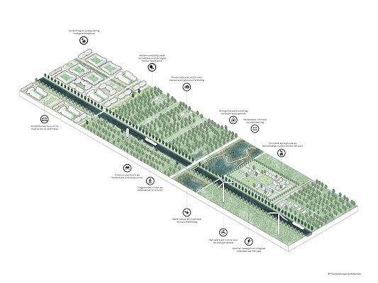 In het plan van Flux wordt het park “op een circulaire wijze” gerealiseerd. Zo wordt afgegraven grond hergebruikt voor de gedeeltelijke overkapping van de A12, stelt het bureau voor. Door de diverse functies en programma’s in het landschapspark te concentreren, kunnen gevoelige landschappen in de regio bespaard blijven van deze ruimteclaims.