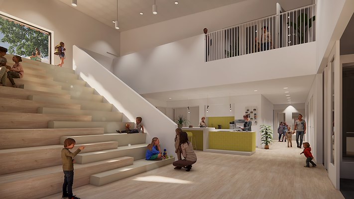 Er is gekozen voor een compact gebouw met een heldere structuur. Via de hoofdentree stappen de bezoekers meteen een dubbelhoge ontmoetingsruimte binnen met een theatertrap, een multifunctioneel speellokaal en een kookatelier.