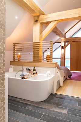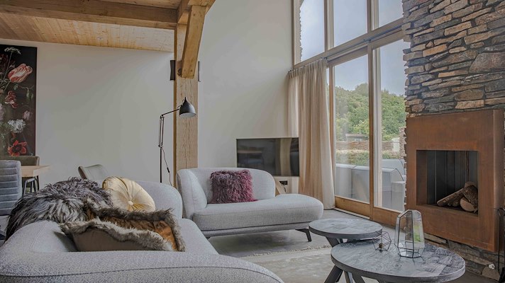 Het interieur omvat drie grote slaapkamers, elk met volwaardige, open badruimte. Een natuurstenen schoorsteen geeft de woonkamer een open haard en biedt tegelijkertijd een buitenhaard. Om de bezoekers een maximaal buitengevoel te geven heeft elke villa een buitenkeuken met een kamado-barbecue en een houten bad.