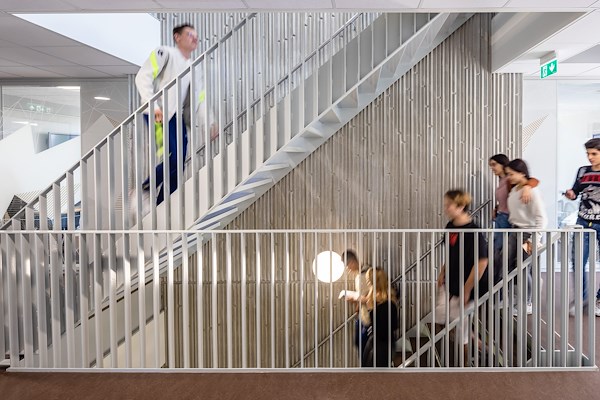 Brede zittrappen rond de Arena maken de verbinding met de aula op de eerste verdieping. Vanaf de aula strekken zich twee vleugels met lokalen in een traditionele opzet. De vele zichtlijnen zorgen voor overzicht en structuur in het gebouw, waardoor het vriendelijk en kleinschalig aandoet, legt het bureau uit.