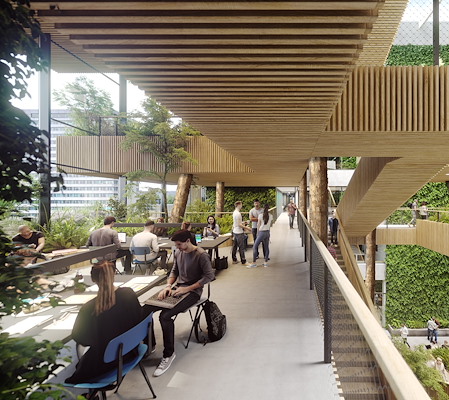 , centraal op de campus. Dankzij de glazen gevel krijgt het pand een transparant karakter, het vele groen en houtaccenten moeten de sfeer en verblijfskwaliteit versterken.