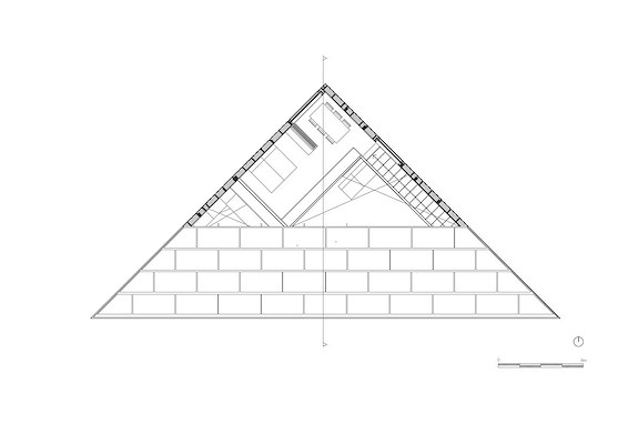 De woning heeft een driehoekige vorm en is voorzien van een veranda langs de volledige voorgevel. Dit ontwerp, in combinatie met de positionering van het huis, zorgt voor schaduw in de zomer terwijl de woning volop zonnewarmte in de winter vangt. In de ochtend en avond valt zonlicht binnen door de ramen in de zijgevels.