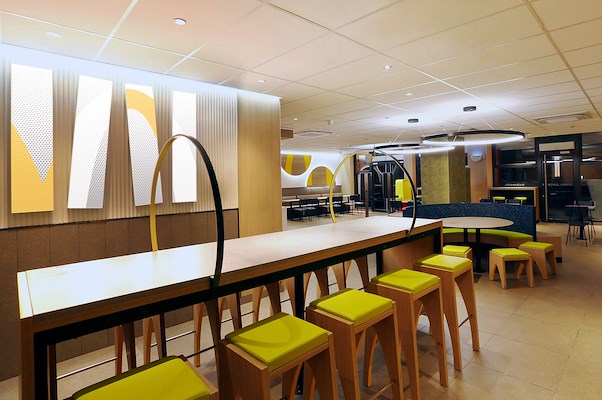 Uiteraard is het ook een knipoog naar de beroemde ‘golden arches’ van het McDonald’s-logo. De (half)ronde vormen zijn onder meer terug te vinden in tafels, zitjes, verlichtingsarmaturen en de scheidingswanden van geperforeerd staal. In het grafisch werk op de muren zijn fragmenten van het logo te zien.