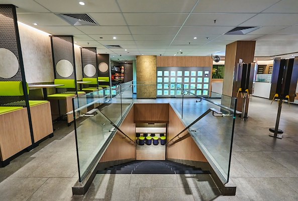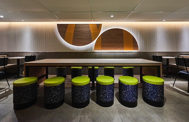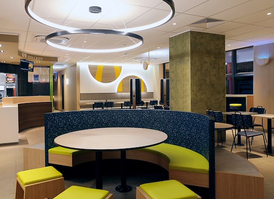 Het nieuwe interieur, waarin tevens hout, gestructureerde vinylbekleding en betonlooklaminaat zijn toegepast, moet de bezoekers een speelse en gevarieerde omgeving bieden. Het ontwerp sluit aan op het huidige interieur van de restaurants en biedt overzicht en doorkijkjes, zodat bezoekers elkaar kunnen zien en het personeel een oogje in het zeil kan houden.