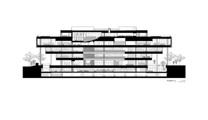 Op dezelfde verdieping zijn ook drie multifunctionele ruimtes voor educatie en workshops, een café en vier buitenruimtes, ingericht als daktuinen. Helemaal bovenin liggen een theater, conferentiezaal en de kantoren van de medewerkers. Vanaf de bovenste verdiepingen heb je door de lamellen heen een prachtig uitzicht over de stad, meldt Mecanoo.