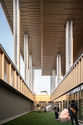 Onder de uitkragingen liggen vier verzonken patio’s voor buitenactiviteiten. De grootste is ook vanaf het plein toegankelijk; hier worden lezingen, concerten en tentoonstellingen georganiseerd. Wie vanuit hier omhoogkijkt, ziet de bijzondere afwerking van de luifels: champagnekleurige aluminium panelen met een lineair verspringend reliëf die ook een deel van de gevels sieren.