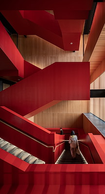 Een ander opvallend element in het gebouw is de rode sculpturale trap die de eerste ondergrondse en alle bovengrondse verdiepingen doorsnijdt. De verkeersruimte is overal zichtbaar dankzij het subtiel met houten latten bekleedde trappenhuis. Ook de begane grond is afgewerkt met hout; hier bevinden zich de ontvangstbalie, een ‘huiskamer’ om kranten en tijdschriften te lezen, touchscreens om de collectie van de bibliotheek te verkennen en een selfservicepunt om boeken te lenen.