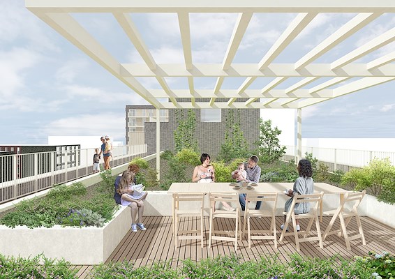 Kleinere kinderen kunnen spelen op de brede galerijen voor de woningen; grotere kinderen pakken de trap van het speeldek naar het plein bij de entree, vertelt Vinke verder. Op de vijfde verdieping komt een groene daktuin.