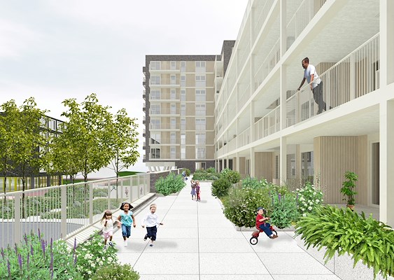 Ook zijn er in het appartementencomplex speel- en ontmoetingsplekken in de buitenlucht. “Het brede leefdek op de eerste verdieping is een veilige plek voor kinderen om buiten te spelen”, zegt Jannie Vinke van ANA Architecten. Het gebouw krijgt zelfs een glijbaan. “Vanaf de tweede verdieping roetsj je als kind naar het leef- en speeldek een verdieping lager.”