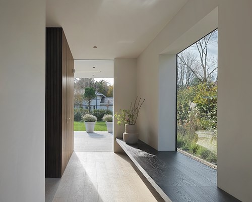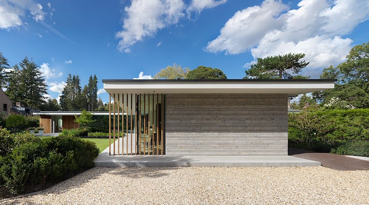 Het rondom overstekende dak zorgt voor schaduw. De gevel bestaat uit een aaneenschakeling van glas, travertijn en hout. Op een aantal plekken loopt het materiaal door in het interieur om de relatie tussen binnen en buiten te versterken. De verfijnde details ondersteunen de paviljoenachtige karakteristiek die ze met dit huis wilden bereiken, leggen de architecten uit.