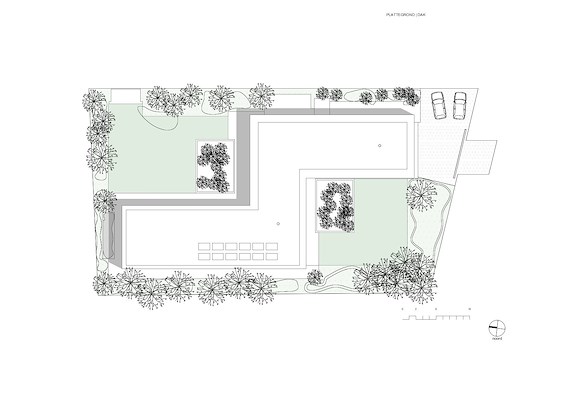 De centrale plek wordt ingevuld door de keuken, die volledig transparant is en de plek waar alle lijnen samenkomen. In een vleugel zijn de slaapkamers gesitueerd, grenzend aan de achtertuin; wonen en werken zijn in de andere vleugel ondergebracht. De afstand en positionering ten opzichte van de straat waarborgt privacy en geeft ruimte aan het zonlicht.