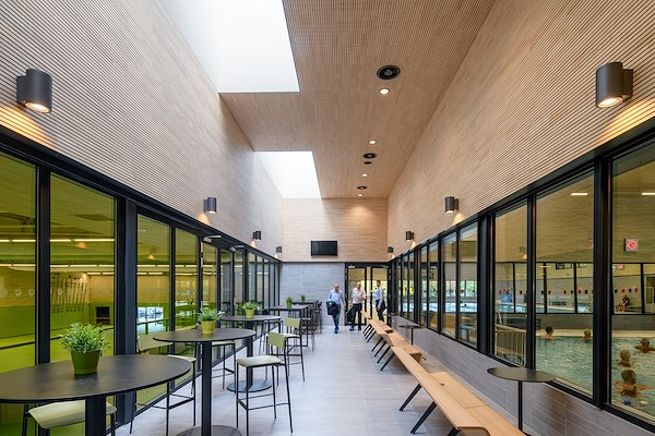 In het interieur vormt de horecagelegenheid het hart. De ruime toepassing van glas zorgt voor een directe relatie van de horecaruimte met zowel de zwembaden enerzijds als de sporthal, die op de begane grond ligt, anderzijds. De strakke vormgeving in combinatie met de ruime toepassing van hout geeft de sporthal en de zwembaden een zowel frisse als warme en uitstraling.