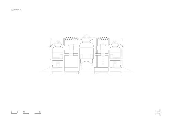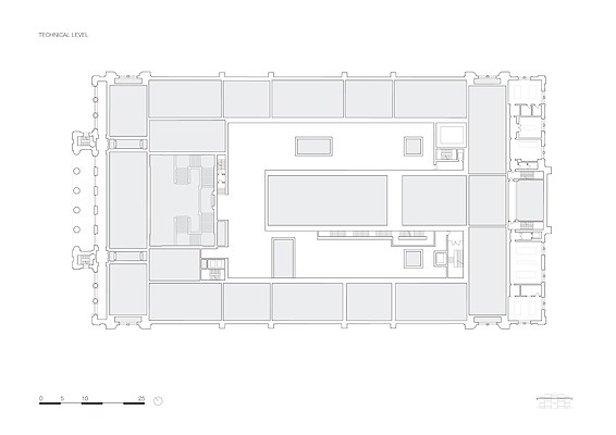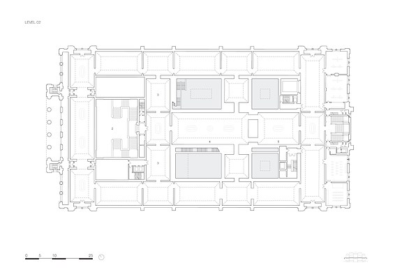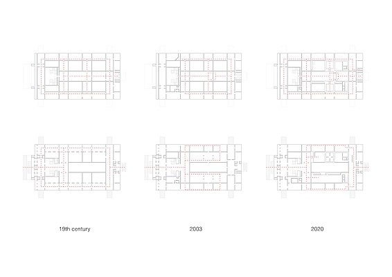- Gevraagde uitbreiding volledig inpandig oplossen door parallel museum van drie lagen in de oude binnenhoven op te nemen. Deze nieuwe tijdlaag steekt minimaal uit boven bestaande dak, zodat deze bij een wandeling rond het gebouw niet zichtbaar is;