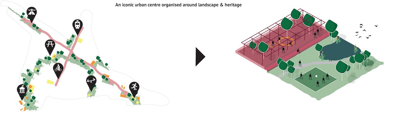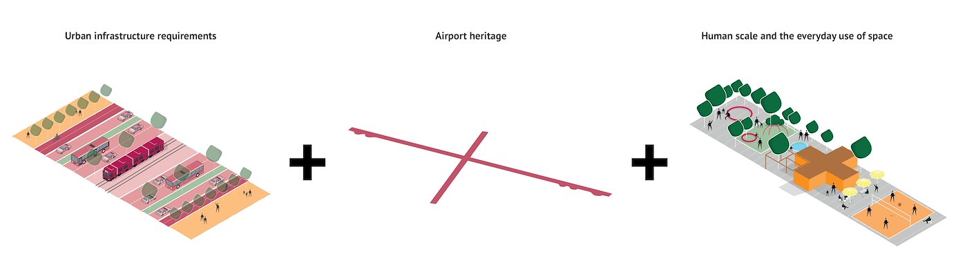 De infrastructuur van de luchthaven vormt het belangrijkste kader voor de plannen, legt het team uit. De voormalige landingsbanen gaan de belangrijkste verkeersaders vormen; de niet meer in gebruik zijnde bebouwing wordt getransformeerd voor publieke functies, gesitueerd aan een groen netwerk. Deze groene aders strekken door het hele plangebied en daarbuiten, om aan te sluiten op de omgeving. Ze moeten stedenbouw, recreatie en ecologie combineren, aldus het ontwerpteam.