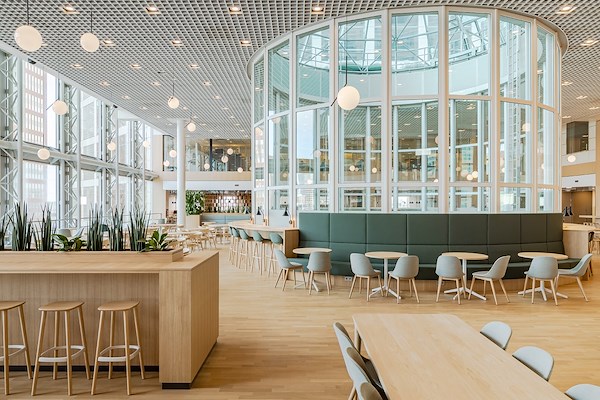 Zowel bij de entree als in het restaurant is een variatie aan maatwerkmeubilair geplaatst, waar de gebruikers kunnen ontspannen, lunchen of vergaderen. Het publieke café op de begane grond biedt eveneens ruimte om te flexwerken, overleggen of lunchen. Ter verdere bevordering van het welzijn van de gebruikers wordt er gezond eten aangeboden in het restaurant en café.