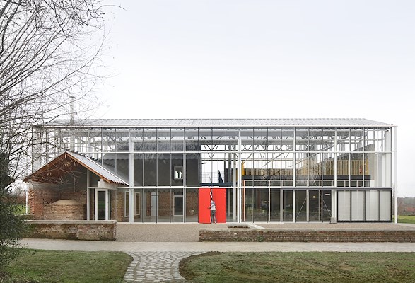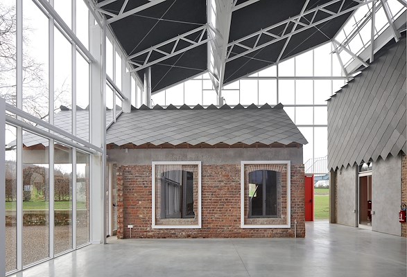De kas doet dienst als onverwarmde tussenruimte, legt het architectenbureau uit. Het bureau noemt de gelaagdheid van de oude en nieuwe structuren, en de relatie met de omgeving de charme van het gebouw. āElke gevel biedt een eigen perspectief op de omgeving en vice versaā, aldus jo taillieu architecten.