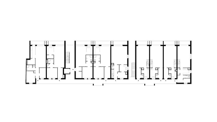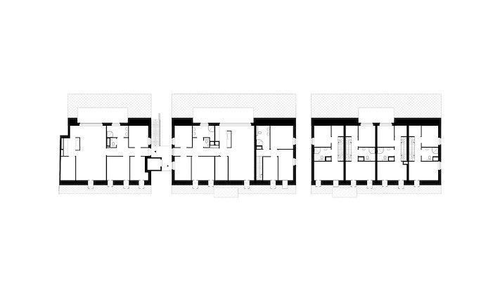 Tussen de drie volumes leiden openingen naar dit achtergelegen groengebied. In de achtergevel hebben de schuine lijnen een tweeledige functie, leggen de architecten uit: ze vormen de scheiding tussen de terrassen en oriƫnteren de wooneenheden op de binnentuin.