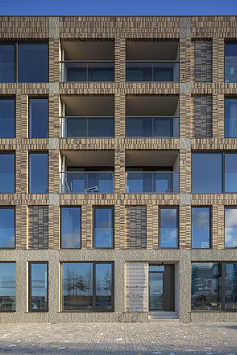 De plint is gerealiseerd van prefab sierbeton, de gevels erboven bestaan uit metselwerk op een basis van zelfdragend prefabbeton. Het metselwerk is speciaal voor dit project samengesteld en bestaat uit zand- en bruinkleurige bakstenen, die qua kleur refereren aan het eiland en aan het nabijgelegen stadsstrand. Raamkozijnen en de randen van de balkons zijn van aluminium.