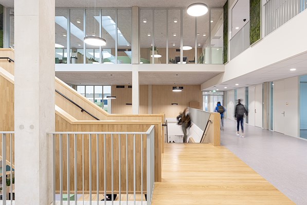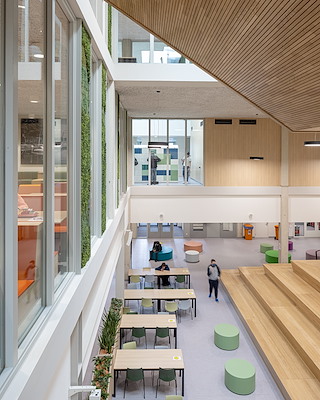 ontwierp een flexibel gebouw binnen een betonnen skelet voor de onderwijsinstelling. Dankzij deze opzet is onder meer verandering van invulling en functies mogelijk.