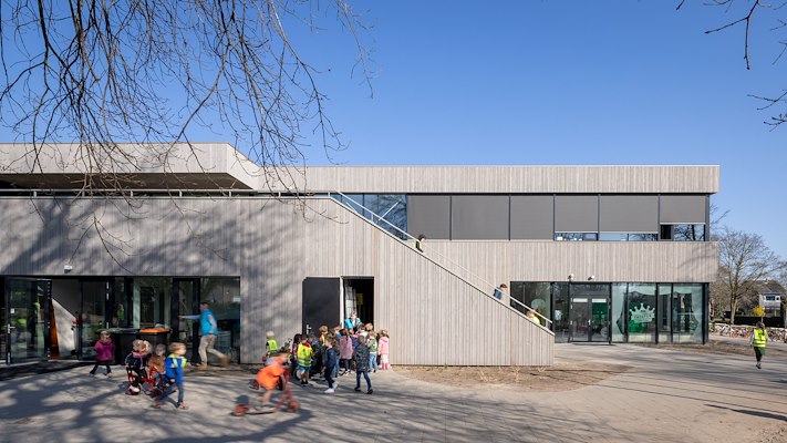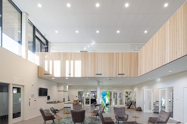 Met het oog op duurzaamheid heeft het architectenbureau een compact, tweelaags gebouw ontworpen. Een ruime vide vormt het hart van het gebouw en zorgt voor de ruimtelijke en visuele verbinding van ruimten op de begane grond en de verdieping. Zowel ouders en kinderen als leerkrachten kunnen gebruik maken van deze heldere ontmoetingsruimte.