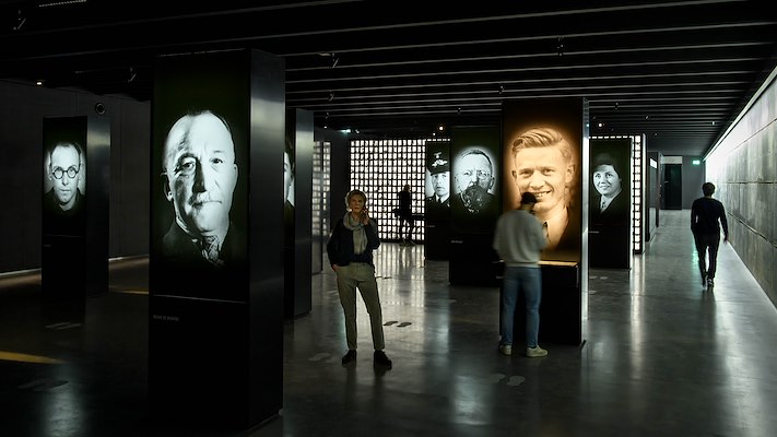 Aan de zuidzijde van de binnenplaats heeft Prins een spiegelend paviljoen ontworpen. Dit is de toegang tot het ondergrondse museum. Maar het paviljoen bevat bovengronds eerst nog een verrassing: de binnencontour van het kantoor van de SS-kampcommandant met de muurschilderingen die daar destijds te zien waren. De ene schildering laat mensen zien die op het land (gedwongen?) aan het werk zijn, de andere schildering is een vogelvluchtperspectief van het kamp zelf.