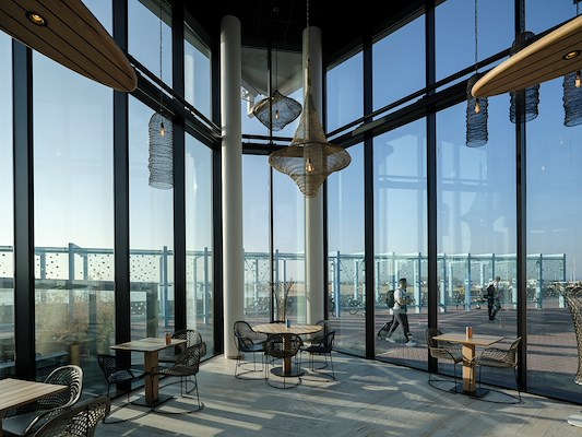verdieping. De hotelkamers zijn voorzien van glas over de hele hoogte voor een indrukwekkend uitzicht over de Noordzee, het Noorderstrand en de skyline van Den Haag.