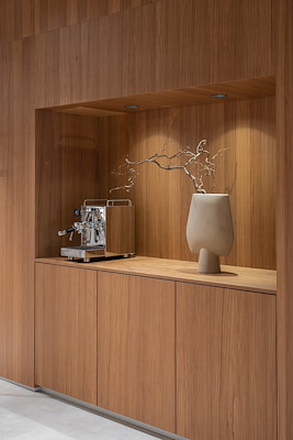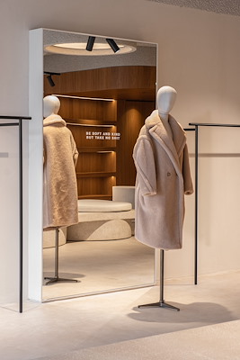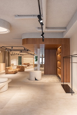 Het interieurconcept is, zo legt Studio &Space uit, geïnspireerd door ‘moderne vrouwelijkheid’ en speelt met contrasten. De basis is sober en kalm, met ingetogen, naturelle tinten. Zware, massieve volumes staan verspreid door de ruimte als presentatiemeubels.