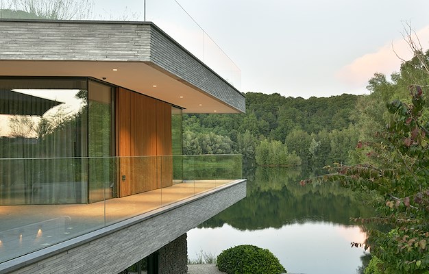 opgeleverd. Vanaf het water gezien rijst Villa M op vanuit het talud, met een massieve leistenen plint en daarboven een lichtere bouwmassa. De woonkamer hangt boven het talud, waardoor de bewoners fraai uitzicht hebben en het gevoel krijgen vrij boven het water te wonen.