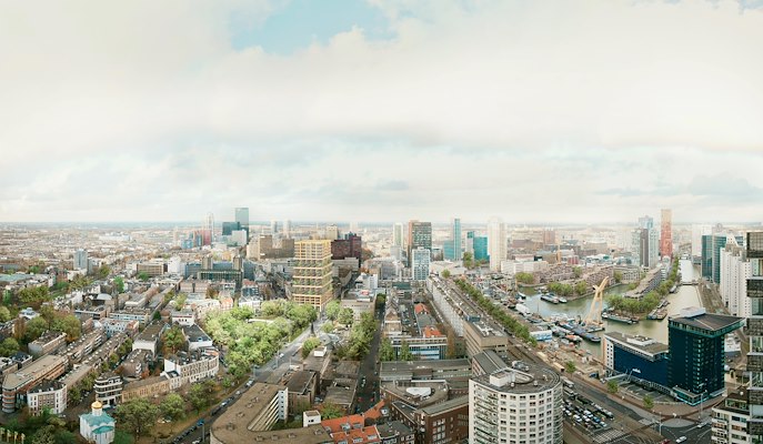 Toren in centrum Rotterdam als een woonerf op hoogte