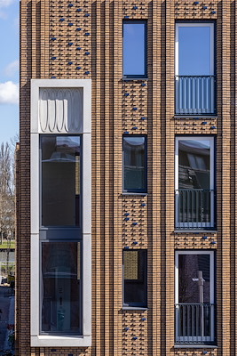 De verschillende beukmaten en verdiepingshoogtes gaven daarbij aanleiding tot veel variatie in het straatbeeld, voegt Jansen toe. Het rijk gedetailleerde metselwerk is naar het ontwerp van KOW uitgevoerd door aannemer Klaassen.