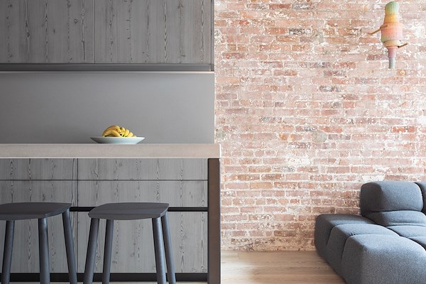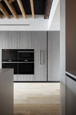 Dubbelhoge ramen, een dakraam en een indrukwekkend grote raamopening op het zuiden laten ruimschoots daglicht toe in wat anders een donkere en smalle leefruimte was geweest. De ramen benadrukken in het interieur bovendien de sterke verticaliteit en dragen bij aan een dynamische ruimtelijke ervaring, vertellen de architecten.